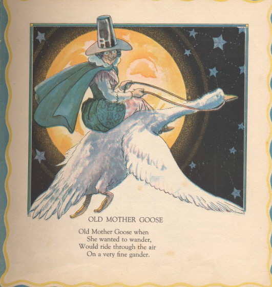 In fact, there’s a fair amount of debate about who, if anyone, Mother Goose was. Some say “Mother Goose” was a lady named Mary Goose. Perhaps. There’s a gravestone in Boston from the 1690s that tourists like to visit. Looking way back, we find the name in Charles Perrault’s 1695 book, subtitled “Tales of my Mother Goose.” It was translated into English in 1729. However, the primary association of Mother Goose and nursery rhymes probably began with John Newbery’s 1791 collection called Mother Goose’s Melody