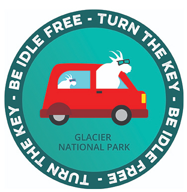 The Glacier National Park Conservancy funded the design and printing of stickers depicting cartoon mountain goats traveling in a red vehicle with the slogan, “Be idle free – Turn the key.” The stickers will be free to visitors and will be available from rangers outside the Apgar and Logan Pass Visitor Centers and in the Rising Sun area. The logo will also be used in park messaging to remind employees and visitors to shut off their vehicles while waiting.