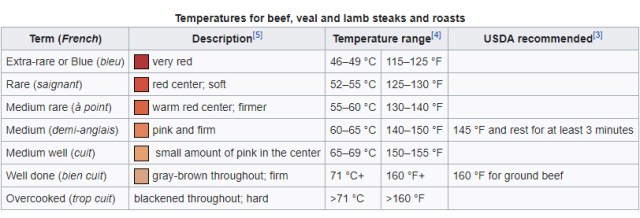 I doubt it would help. My simple rule of thumb is that if the color of the steak matches the color of my red wine, the steak is undercooked. I’ve had multiple arguments with servers about the doneness of my steaks, but then I didn’t have the chart with me. Usually, couple of thugs with meat cleavers come out of the kitchen and say, “Something wrong with your food, you uncultured oaf.”