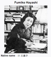 • Fumiko Hayashi (1903-1951) was a prolific, successful, and influential Japanese novelist (Diary of a Vagabond, Floating Clouds) who unfortunately is little known today. I mention her work in my novel in progress, especially The Town of Accordions and Fish (aka Accordion in a Fish Town), so I’m learning more about her in hopes of avoiding one faux pas or another.
