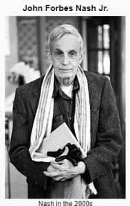 Sad to say, I don’t think the film–as much as I liked it–left me with a strong sense of what Nash’s specialty was. Wikipedia states that “John Forbes Nash, Jr. (June 13, 1928 – May 23, 2015), known and published as John Nash, was an American mathematician who made fundamental contributions to game theory, real algebraic geometry, differential geometry, and partial differential equations. Nash and fellow game theorists John Harsanyi and Reinhard Selten were awarded the 1994 Nobel Memorial Prize in Economics. In 2015, he and Louis Nirenberg were awarded the Abel Prize for their contributions to the field of partial differential equations.”