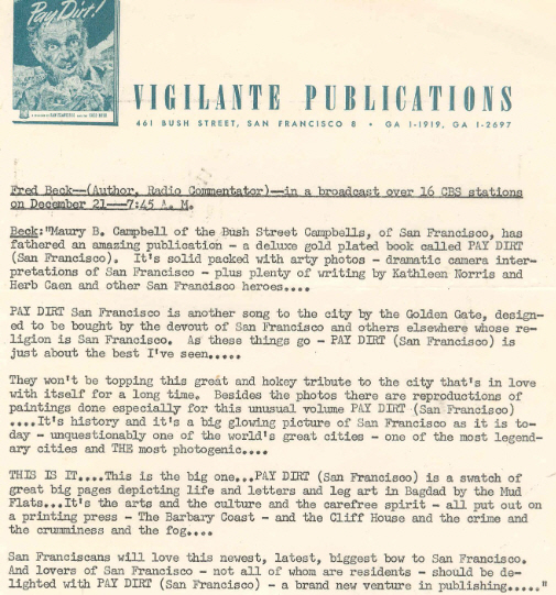 My late uncle Maury B. Campbell edited this lavish, spiral-bound love letter to San Francisco in 1949. As a child, I was a little scared of the old prospector on the cover but found myself drawn to the photographs inside. If you search for the book on Google, you’ll find it for sale (used) for $30 to $50.