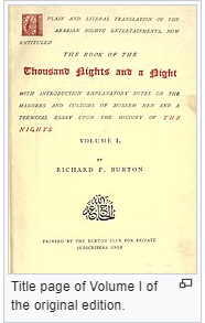 “THE BOOK OF THE Thousand Nights and a Night VOLUME V Translated by RICHARD F. BURTON Limited to one thousand numbered sets 1885 (London “Burton Club” edition), illustrated The Book of the Thousand Nights and a Night (1885), subtitled “A Plain and Literal Translation of the Arabian Nights Entertainments”, is a celebrated English language translation of “One Thousand and One Nights” (the “Arabian Nights”) – a collection of Middle Eastern and South Asian stories and folk tales compiled in Arabic during the Islamic Golden Age (8th−13th centuries) – by the British explorer and Arabist Richard Francis Burton (1821–1890). It stood as the only complete translation of the Macnaghten or Calcutta II edition (Egyptian recension) of the “Arabian Nights” until 2008. “One Thousand and One Nights” (Arabic: كِتَاب أَلْف لَيْلَة وَلَيْلَة kitāb ʾalf layla wa-layla) is a collection of Middle Eastern and South Asian stories and folk tales compiled in Arabic during the Islamic Golden Age. It is often known in English as the Arabian Nights, from the first English language edition (1706), which rendered the title as The Arabian Nights’ Entertainment. The work was collected over many centuries by various authors, translators, and scholars across West, Central, and South Asia and North Africa. The tales themselves trace their roots back to ancient and medieval Arabic, Persian, Mesopotamian, Indian, Jewish and Egyptian folklore and literature. In particular, many tales were originally folk stories from the Caliphate era, while others, especially the frame story, are most probably drawn from the Pahlavi Persian work Hazār Afsān (Persian: هزار افسان, lit. A Thousand Tales) which in turn relied partly on Indian elements. Initial frame story of the ruler Shahryār (from Persian: شهريار, meaning “king” or “sovereign”) and his wife Scheherazade, (from Persian: شهرزاد, possibly meaning “of noble lineage”), and the framing device incorporated throughout the tales themselves. The stories proceed from this original tale; some are framed within other tales, while others begin and end of their own accord. The bulk of the text is in prose, although verse is occasionally used for songs and riddles and to express heightened emotion. Most of the poems are single couplets or quatrains, although some are longer.”