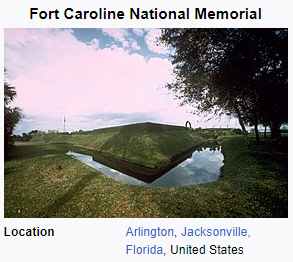 “Fort Caroline was an attempted French colonial settlement in Florida, located on the banks of the St. Johns River in present-day Duval County. It was established under the leadership of René Goulaine de Laudonnière on 22 June 1564, following King Charles IX’s enlisting of Jean Ribault and his Huguenot settlers to stake a claim in French Florida ahead of Spain. The French colony came into conflict with the Spanish, who established St. Augustine in September 1565, and Fort Caroline was sacked by Spanish troops under Pedro Menéndez de Avilés on 20 September. The Spanish continued to occupy the site as San Mateo until 1569.” – Wikipedia