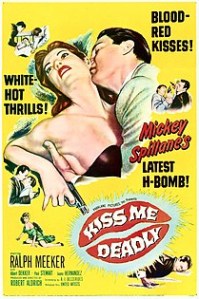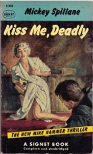 The book was made into a film by the same name in 1955 starring  Ralph Meeker as Hammer. According to Wikipedia, “Critics have generally viewed the film as a metaphor for the paranoia and fear of nuclear war that prevailed during the Cold War era. “The great whatsit,” as Velda [Mike’s assistant] refers to the object of Hammer’s quest, turns out to be a mysterious valise, hot to the touch because of the dangerous, glowing substance it contains, a metaphor for the atomic bomb. The film has been described as “the definitive, apocalyptic, nihilistic, science-fiction film noir of all time – at the close of the classic noir period.” A leftist at the time of the Hollywood blacklist, Bezzerides denied any conscious intention for this metaphor in his script, saying that “I was having fun with it. I wanted to make every scene, every character, interesting.”