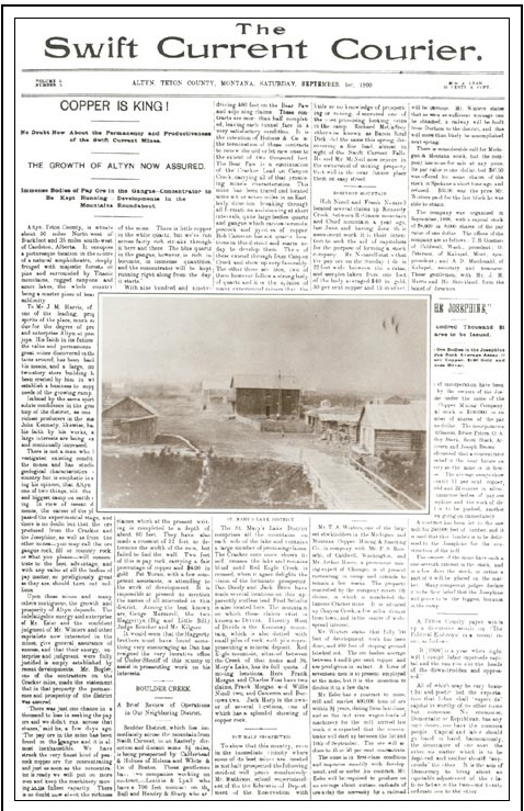 In its one and only issue, Altyn’s Swift Current Courier on September 1, 1900 observed the high-pitched activity within the ceded strip and headlined: “NO DOUBT ABOUT THE PERMANCY AND PRODUCTIVENESS OF THE SWIFT CURRENT MINES.” And also: ‘THE GROWTH OF ALTYN ASSURED.” The stories growing out of the valley chronicled during 1900 by the Acantha, in nearby Dupuyer include: