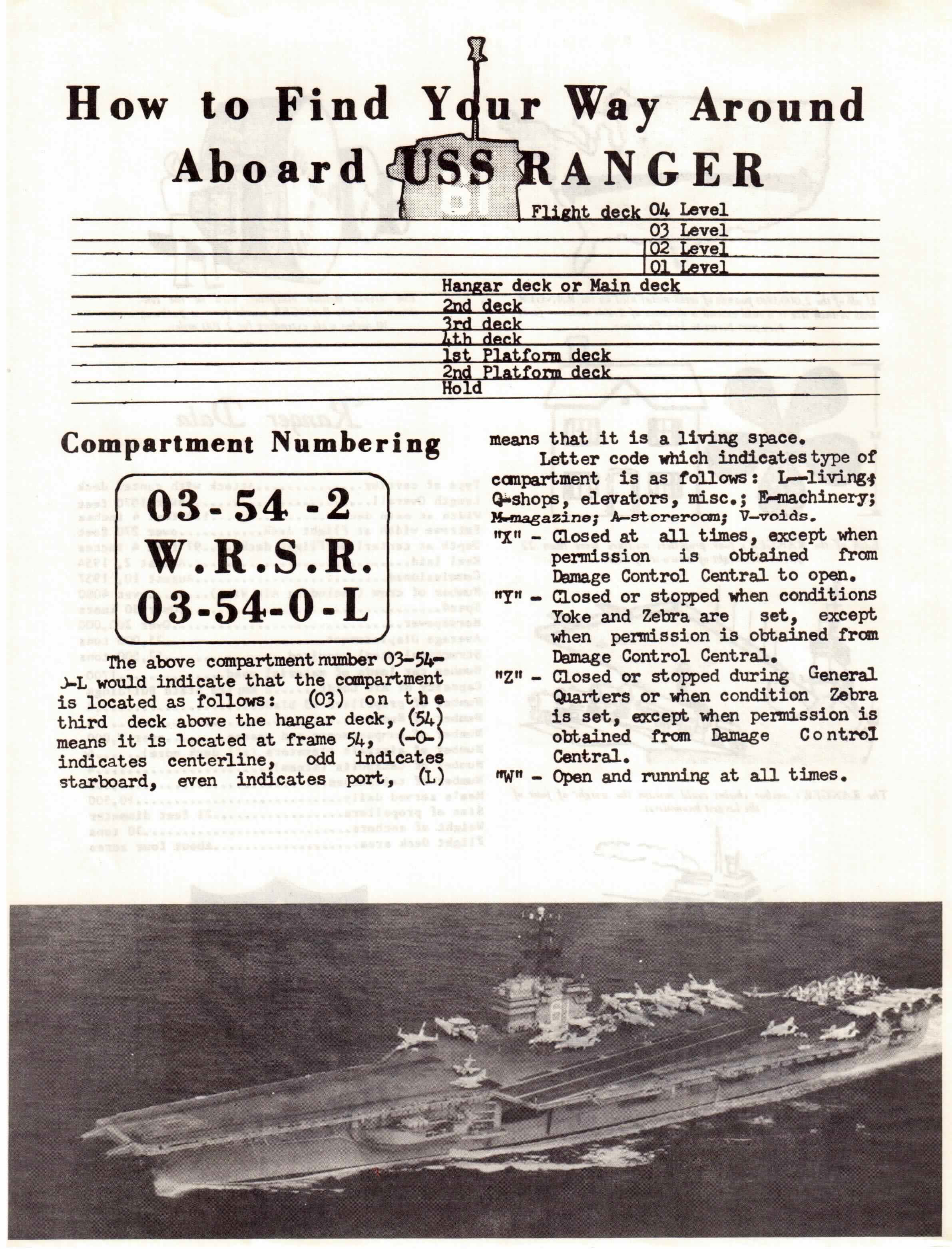 Television shows like JAG and NCIS frequently show shore-based navy and marine personnel getting lost on board aircraft carriers when trying to find their way between the bridge, the mess decks and their quarters. It’s easy to do. We cleared up the confusion for guests by handing out a diagram that showed how the decks were numbered.