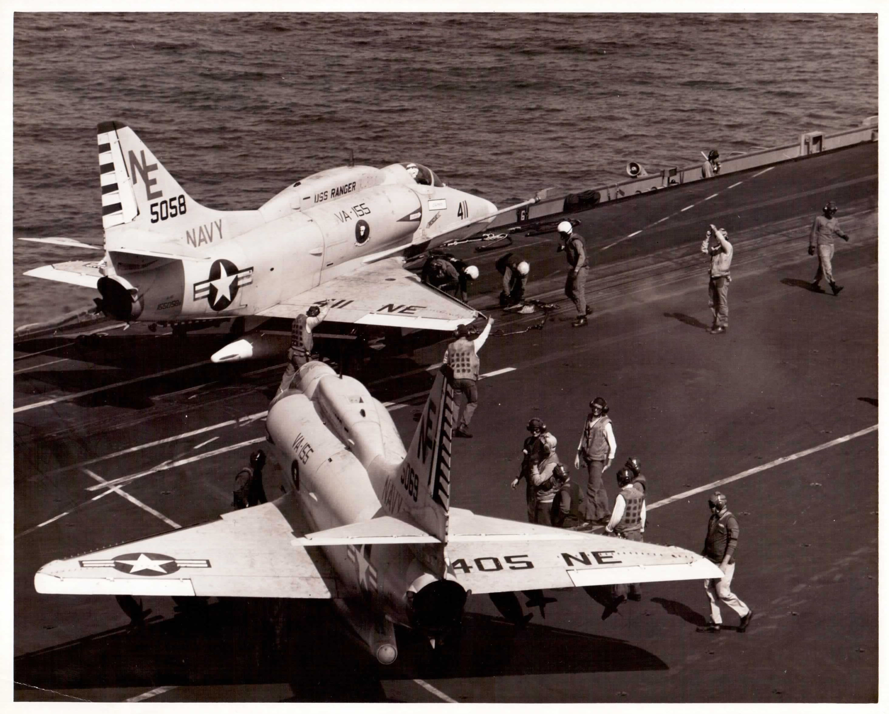Flight deck crews move two A-4 Skyhawks – US Navy photo, cleared for publication.
