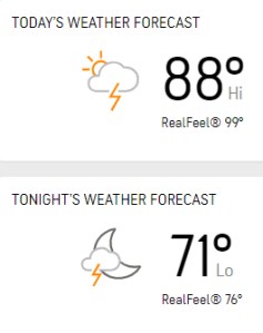 As you can see by the AccuWeather graphic, our heat wave in North Georgia has eased up a bit, leaving us with an outdoor sauna bath without anyone handing out fresh towels and cold beer. At present, my desktop weather simply says “rain off and on.” Other than not having fresh towels, we’re also not having grass dry enough to mow. The yard’s not looking its best right now. About all I’m doing outside these days is pulling the wheelie bin out to the road and going out to buy groceries (which ensures that I’ll have to keep moving garbage from the house to the road).