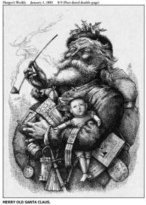 “America’s best-ever political cartoonist is renowned for creating the Republican Elephant and popularizing the Democratic Donkey. He also created the modern images of Santa Claus and Uncle Sam, influenced five victorious Presidential elections, and satirically commented on seven administrations.” – John Adler’s website (This website is a treasure trove of Nast’s political cartoons and other drawings, including the iconic image of Santa shown here.)