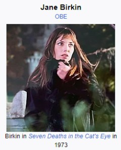 According to USA Today, “Actress and singer Jane Birkin, who inspired fashion-forward Birkin bag, has died at 76.” Frankly, I’m tired of reading news stories about people who are more or less in my generation dying off. According to Wikipedia, “In 2001, Birkin was awarded the OBE. She was also awarded the French Ordre National du Mérite in 2004 and 2015. She won the “Best Actress” award at the 1985 Orleans Film Festival for Leave All Fair. The jury of the 1985 Venice Film Festival recognized Birkin’s performance in Dust as amongst the best of the year but decided not to award the best actress prize because all of the actresses they judged to have made the best performances were in films that won major awards. Dust won the Silver Lion prize. In 2018, she received the Japanese Order of the Rising Sun.”