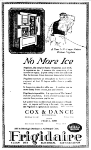 1922 Ad As was thinking over the old names that got engraved in stone, I realized that many of my friends (and sometimes me, horrors) still refer to the refrigerator as the “ice box.” Yes, we called our Frigidaire the ice box when were were kids because ice boxes were still common. My parents bought our Frigidaire when the brand was still made by General Motors and, it was still running many decades later (outlasting my parents). Now, like the word “cellophane,” often used to refer to any clear wrap, many people call their refrigerator a Fridge even though it’s not a Frigidaire. It’s rather like calling any facial tissue a “Kleenex.” We always use Kleenex so we’re in the clear when we refer to our tissues and “Kleenex.”